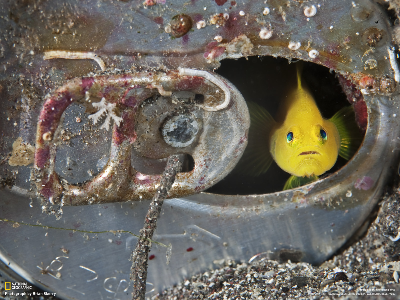 Cerca de la península de Izu, un gobio amarillo asoma a través de la ventana de su corroída lata de refresco que le sirve como casa. Brian Skerry